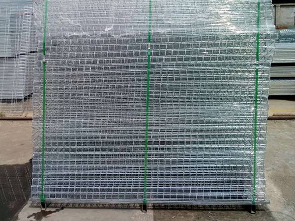 Fence panel: metal/wooden pallet + bundle belt + plastic film. Here we place the BRC fence panels on the metal pallet one by one in order of face up and face down.