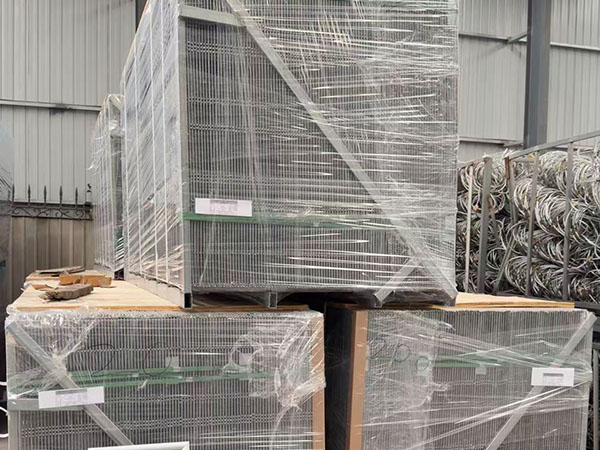 Each edge protection barrier panel is packed on metal pallets, securely strapped, and protected with film wrapping. All components — including edge protection mesh panels, toeboards, posts, and couplers — are clearly labeled for quick on-site assembly.