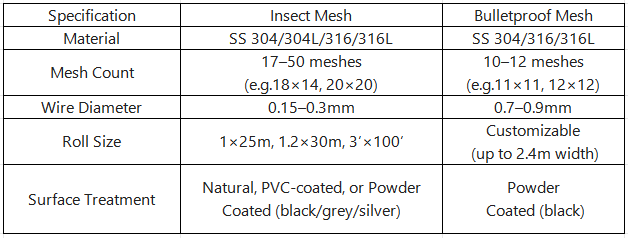 Surface Treatment: Bulletproof Mesh undergoes powder-coating (black, white, or custom colors) for scratch resistance; Insect Mesh may have a polished finish for aesthetics.
